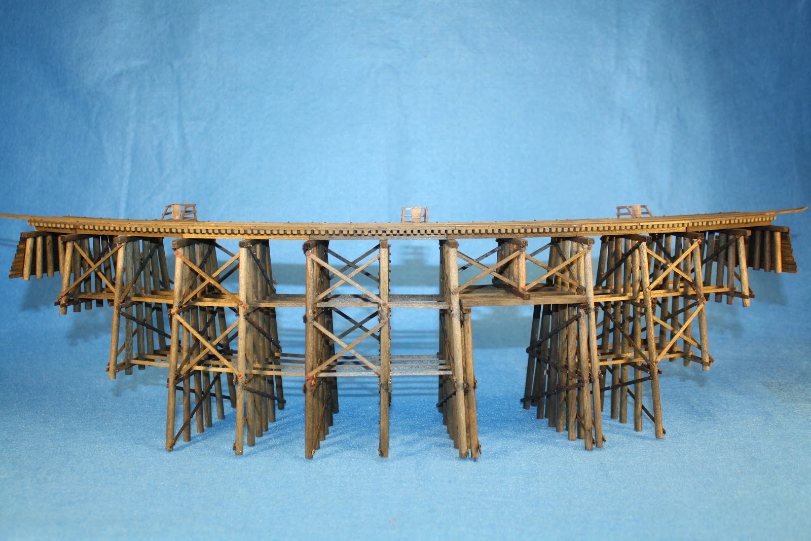 When all the bents were firmly glued in place, I gently turned the entire structure right side up to see how it looked. Even without sway braces and longitudinal braces (or girts) one could see the outline of a 160 foot pile trestle on the workbench!