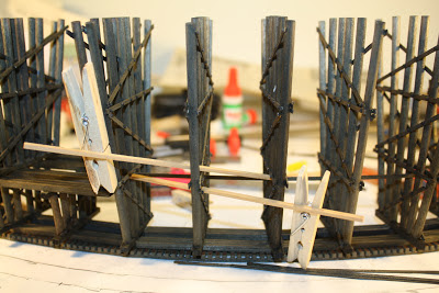 In some cases, applying pressure while the glue dried called for using a variety of objects from around the train room -- for example, here a wooden whistle and a screwdriver serve to keep pressure on one of the longer bents.